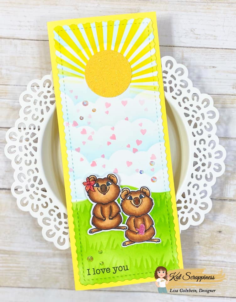My second card is a slimline card with a bright happy scene and a Quokka couple!