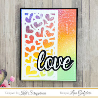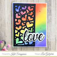 I cut the Heart Panel Die out in black and white and laid them on 2 different rainbow ink blended panels cut using the Embossed Edge Rectangle Dies.  I added the “Love” word die from the
