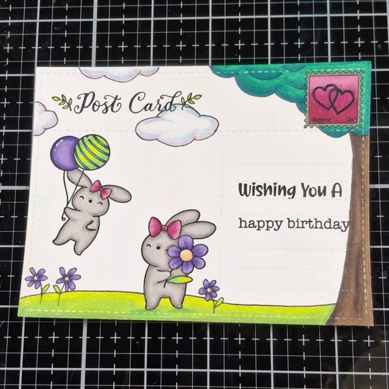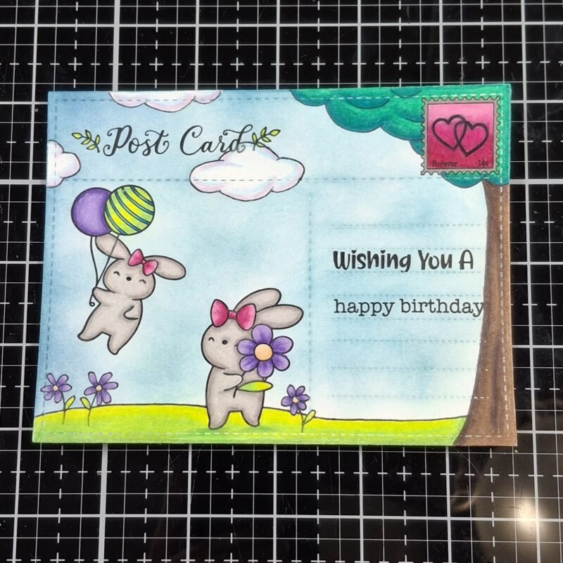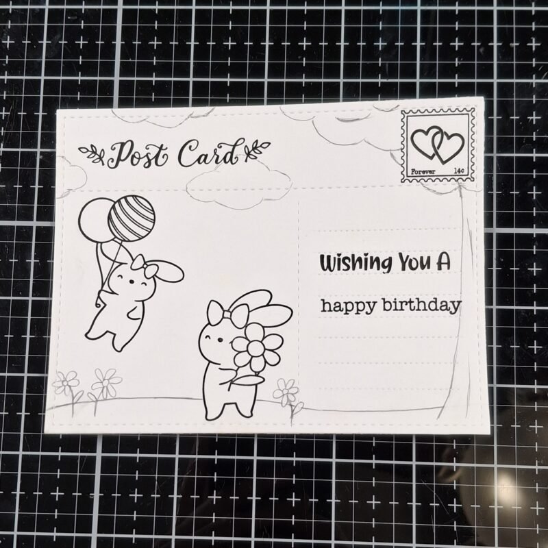 Next, I stamped supporting elements to finish giving the scene a post card look. I used the Be My Valentine stamp set and stamped the word “post card” across the top as well as a stamp in the upper right corner.