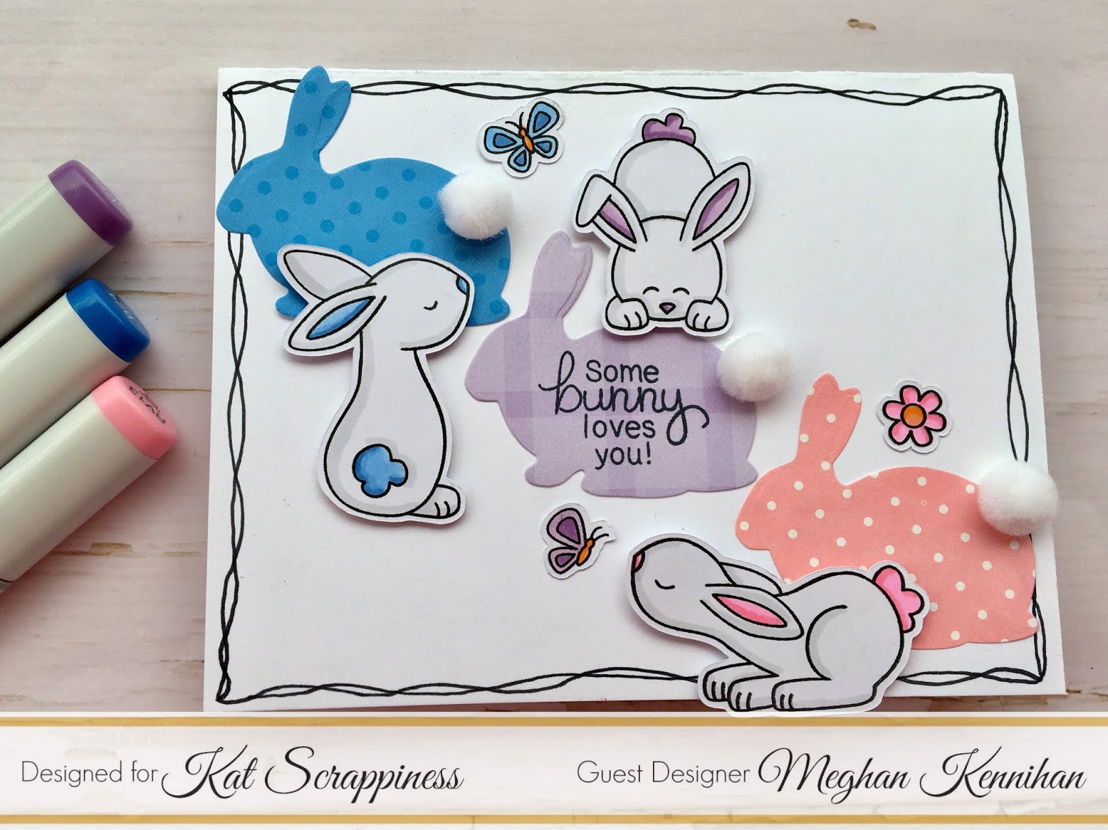 I die cut the bunnies out of three pastel patterned papers. I colored up the bunnies from the Newton’s Nook Bitty Bunnies Set found in the Kat Scrappiness Store to match the die cut bunnies.