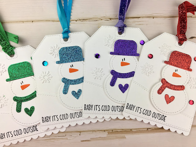 I drew the eyes on the snowmen and glued them to the tags. Then I decorated around them with the snowflake from the Kat Scrappiness Snowflake Kisses die and sequins from Kat Scrappiness Sequin mixes.