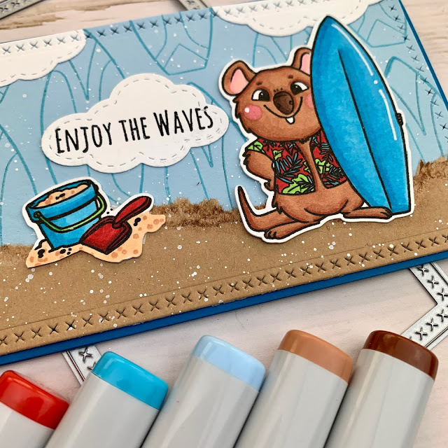It’s time for the Kat Scrappiness Spring Release! We have EIGHT NEW Mini Slimline Dies, a darling Summer Quokka Stamp Set, and tons of fun sprinkles to bring to you! I’m sharing a little beach scene with the NEW Summer Quokka stamp set and Mini Slimline Cross-Stitched Die. I stamped the surf board background with the Summer-Add On Stamp set. Did you know you can win the ENTIRE release on the Kat Scrappiness Facebook Page? Head HERE to join!