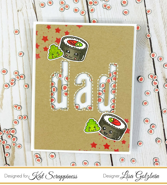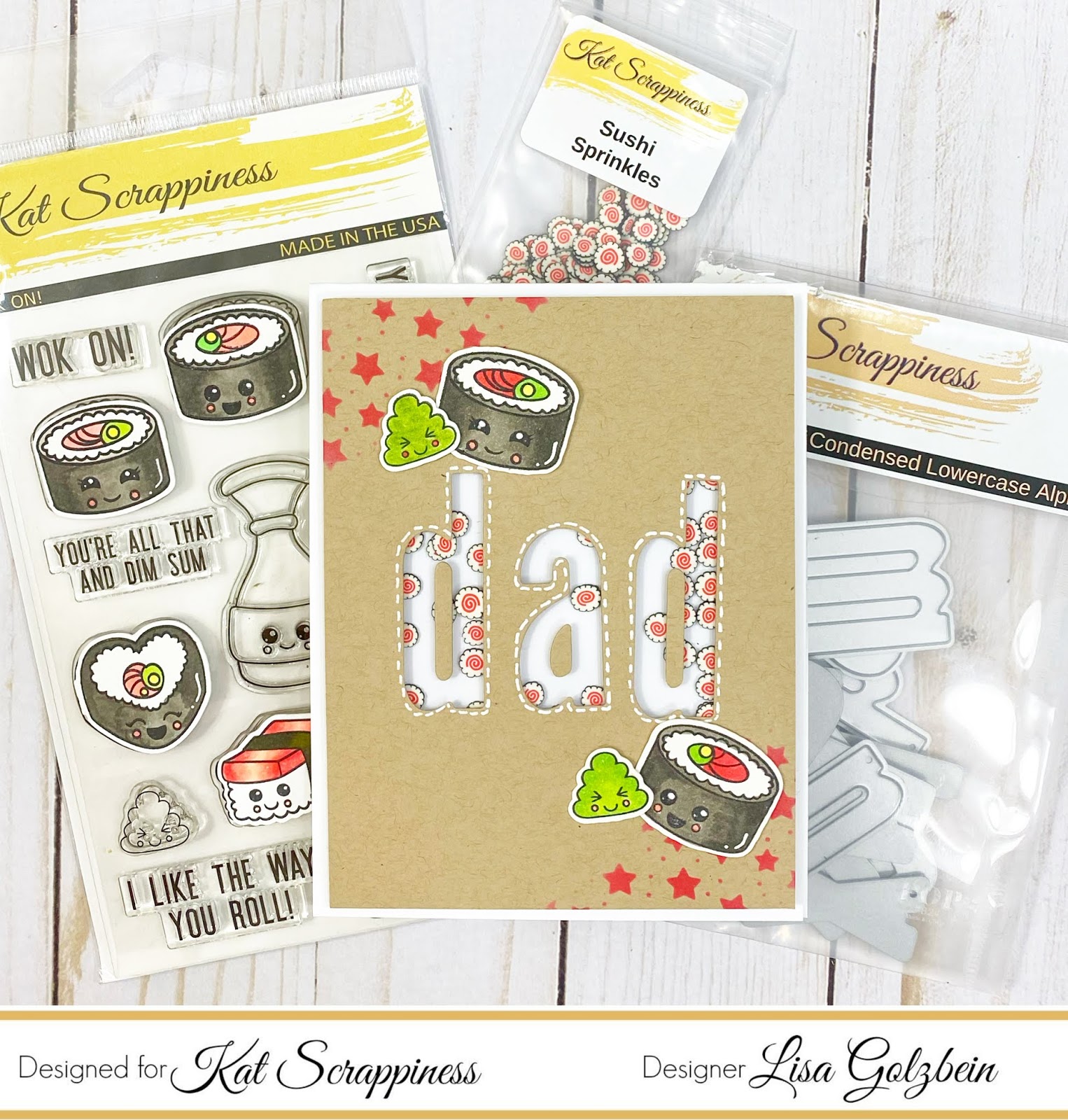 I wanted to make a shaker card using the Condensed Lowercase Alpha dies and spell out the word “dad”. Since my dad loves sushi, I thought it would be fun to use the Wok On stamp set and