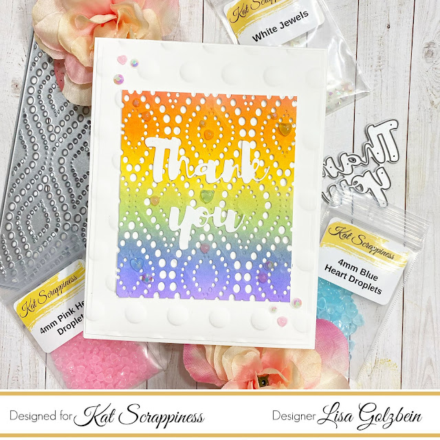 Hello it’s Lisa and today I am up on the Kat Scrappiness blog with a card using some old and new products from the KS store! I made a thank you card because you can never have too many of those! One of my favorite techniques is ink blending and especially in rainbow colors! I just love to make an ink blended rainbow and then cut a pattern out of it. Here’s the short and sweet on how I made my card.