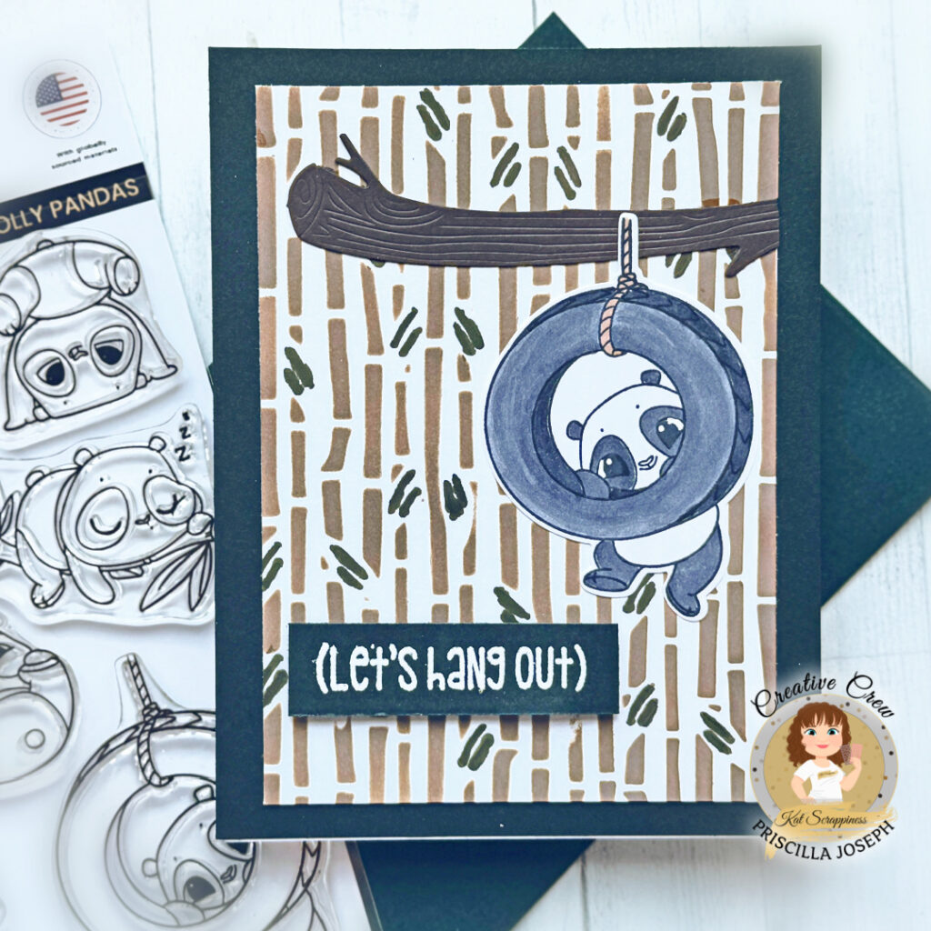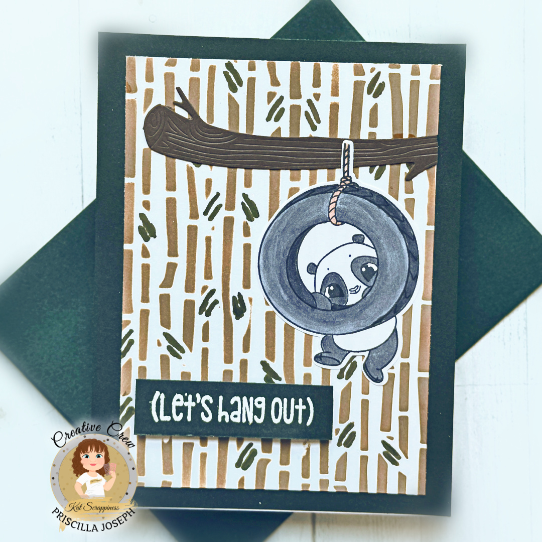 Hello Crafty Friends! Priscilla here from Nubble Light Designs, sharing a playful and pun-filled card featuring the new“Rolly Polly” stamp and die set from Kat Scrappiness! This adorable panda is having the time of his life swinging from a tire on a sturdy branch, surrounded by a hand-colored bamboo background created using the “Bamboo Background Craft Die” as a D.I.Y. stencil. The charming sentiment, “Let’s Hang Out,” ties it all together for a lighthearted design that’s perfect for spreading smiles and a little panda cheer!