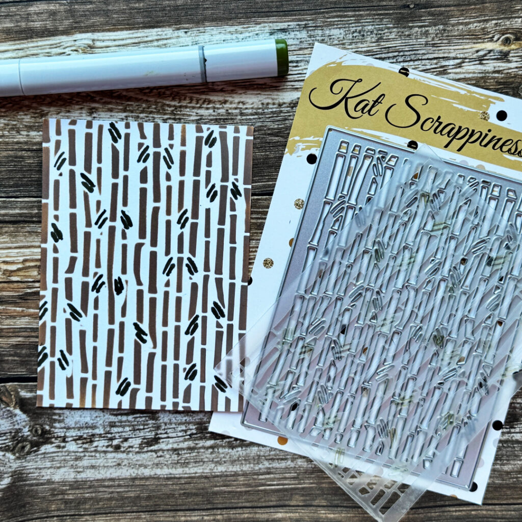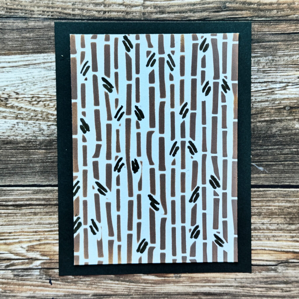 - Using the Bamboo Background Craft Die, created a D.I.Y. mylar stencil and brushed brown ink over it to make a “bamboo” background.