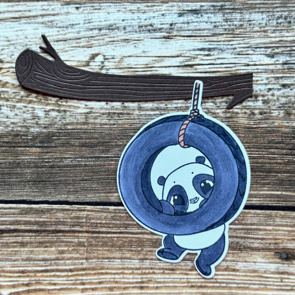 - Stamped, die cut, and colored the panda on the tire swing from the Rolly Polly Pandas stamps/die set.