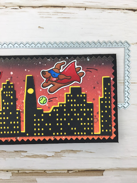 To create this card I used the largest of the Slimline Never Ending Nesting dies and I ink blend that panel with Oxide Inks in colors Blueprint Sketch and Seedless Preserves I added some watersplashes for a spooky night look. I colored my cute zoobies with copic markers and handcut them. I die cut the Slimline Layered Cityscape dies the front part in color black and the background part in color yellow and adhere them together… and that is the beauty and easy way to create a cityscape with this awesome die.