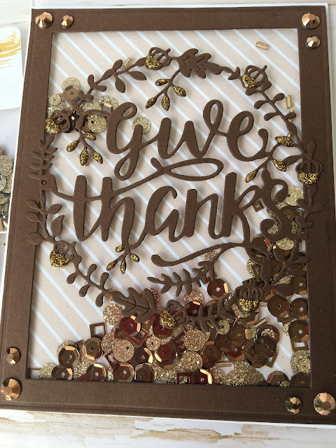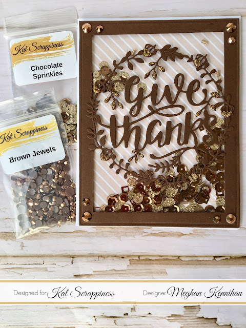 I added Kat Scrappiness Chocolate Sprinkles to the inside for my shaker piece, added Nuvo Glitter Accents Aztec Gold drops to the acorns, and finished the edges with Kat Scrappiness Brown Jewels.