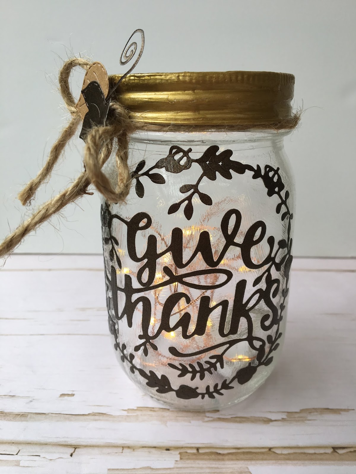I used ModPodge to glue and seal the Give Thanks Wreath Die onto the mason jar.
