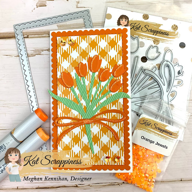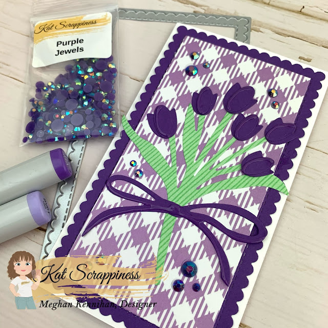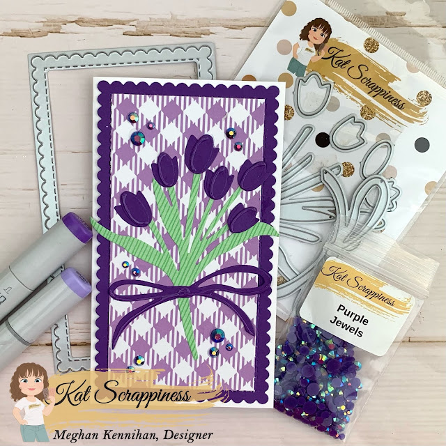 This month’s theme is “Flowers” Kat Scrappiness has the most beautiful floral tulip dies, stamp sets, and sprinkles. We want to see you use them.