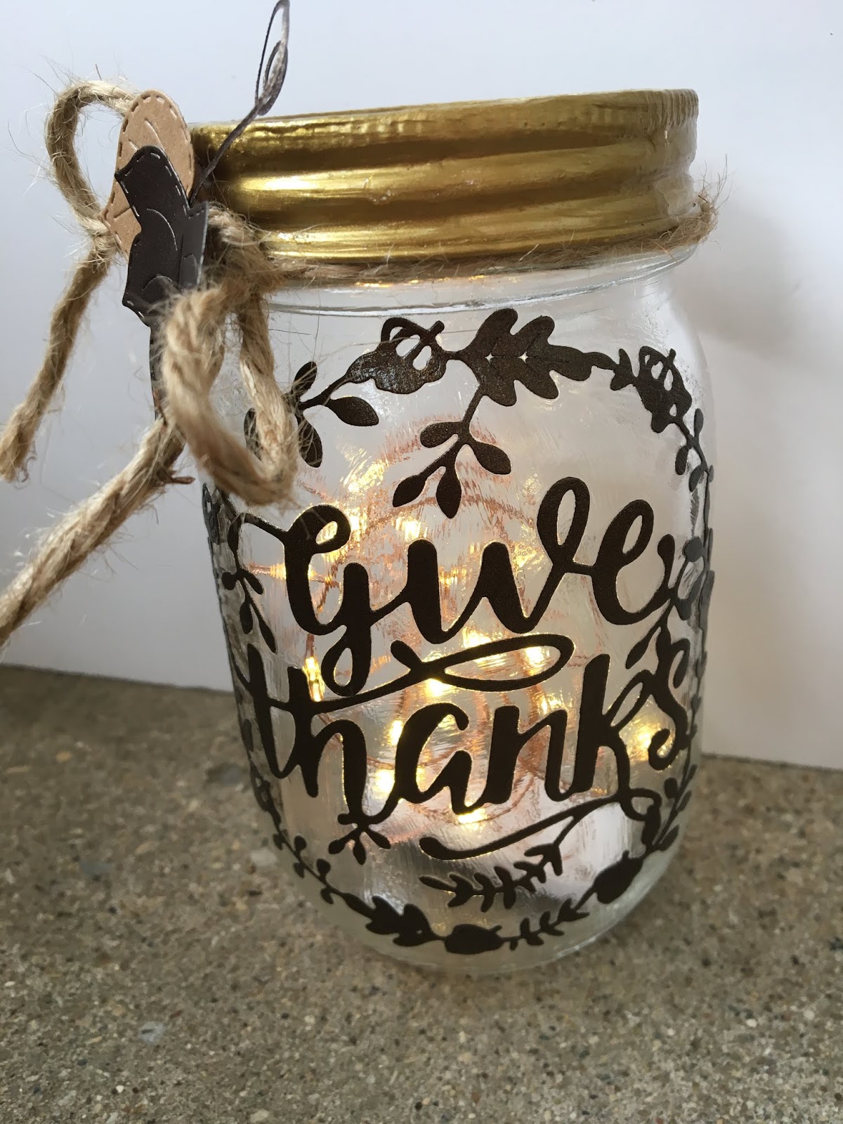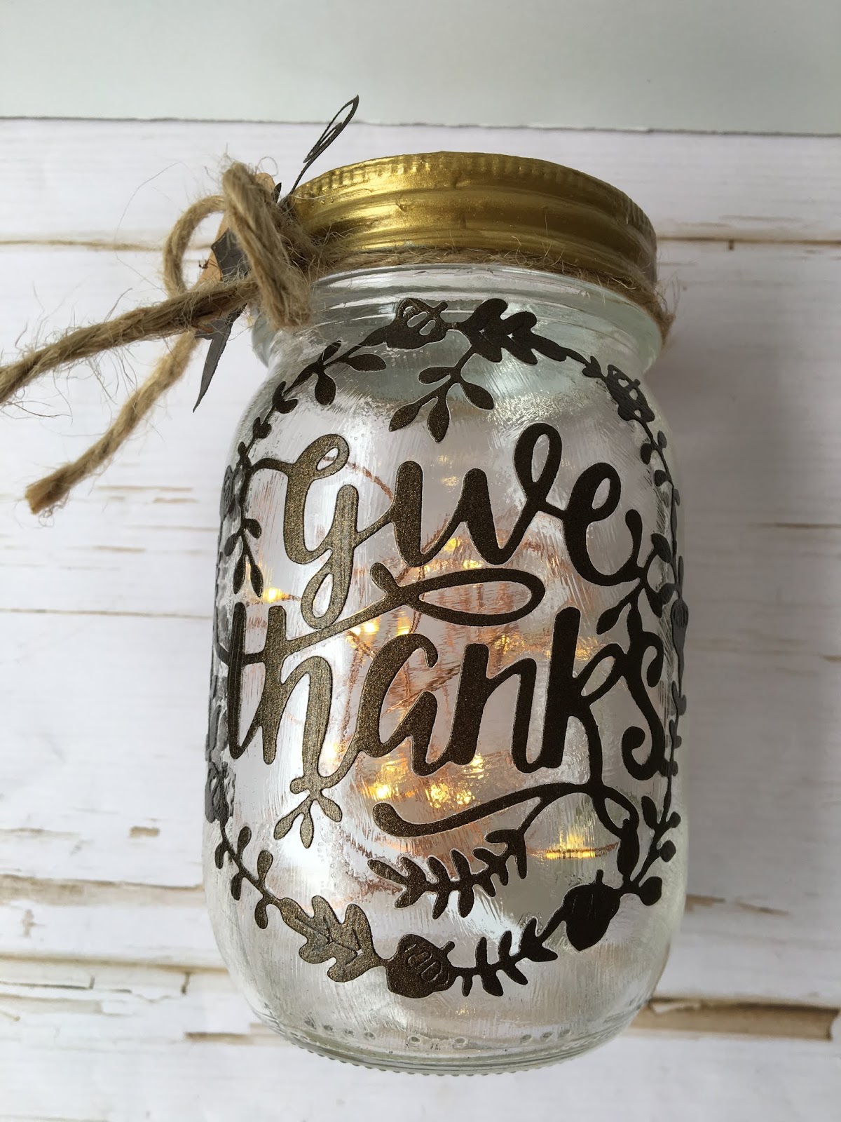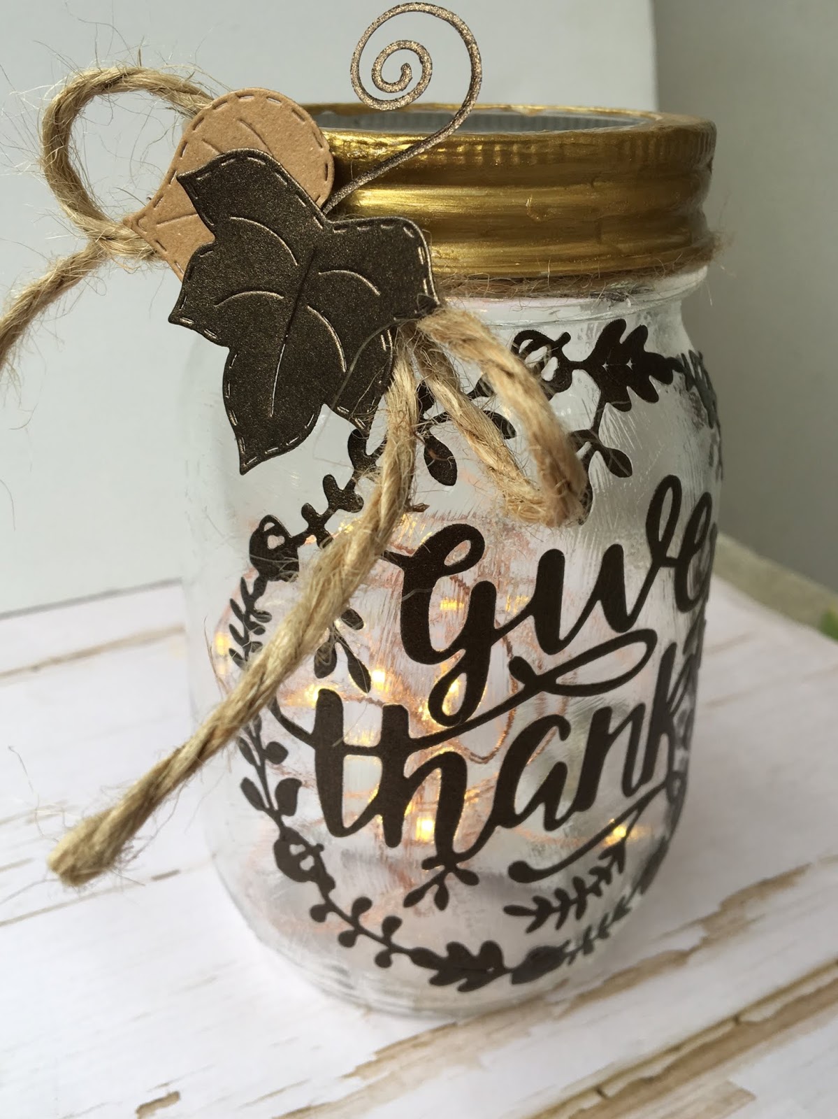I used ModPodge to glue and seal the Give Thanks Wreath Die onto the mason jar.