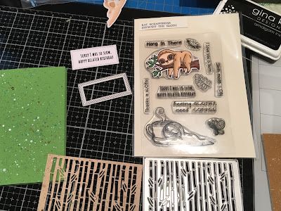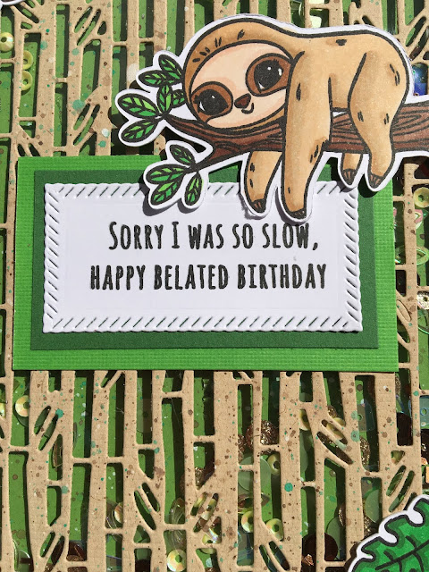 I created my base by just splattering it with the same watercolors. Then I colored up Stewart the Sloth and stamped the Belated Birthday Sentiment, die cutting it out using the Stitched Rope Rectangle Die.