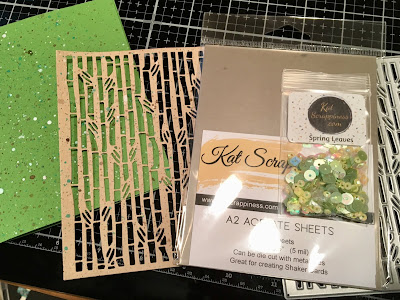 I added my Acetate Sheet to the Bamboo Backdrop Die and then put the Spring Leaves Sequin Mix and Chocolate Sprinkles on my card to create my shaker piece.