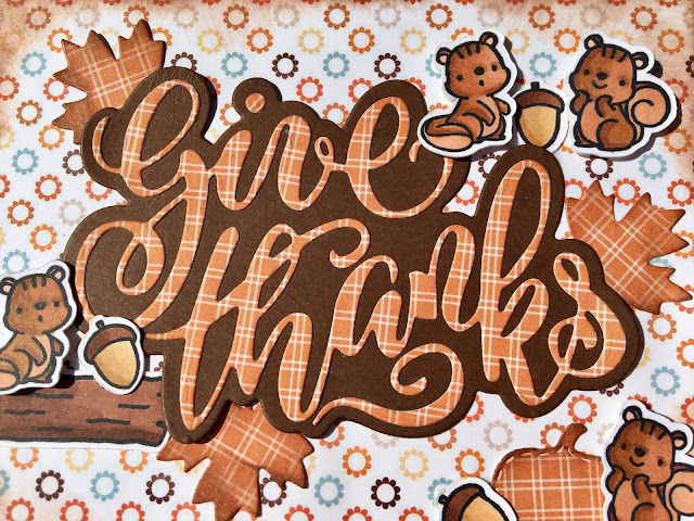 I’m back with another DARLING NEW die from Kat Scrappiness! This one is called Give Thanks Sentiment with Shadow. I LOVE this font! You can also cut it apart and use just the “Thanks” or you can use it without the shadow. There are just so many options. I added these fun fall squirrels who are definitely thankful for their acorns.