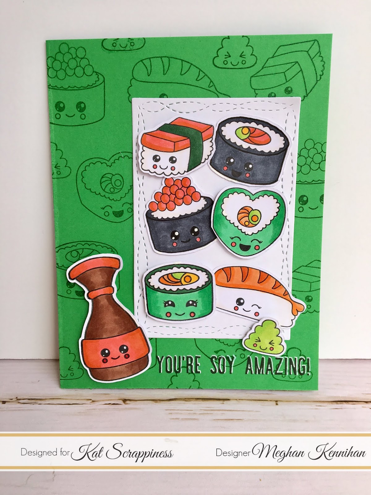More Pun FUN at Kat Scrappiness with this fun Sushi set called “Wok On”. This set was released last week and it’s a hit! Both pun stamp sets are perfect for fun foodie cards! I mean if you don’t like sushi and avocado we need to talk. Get your “roll on” here and use coupon code meghan for 10% off!