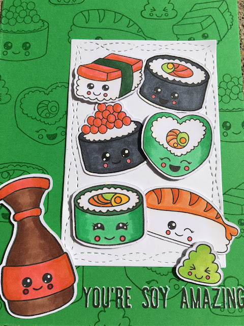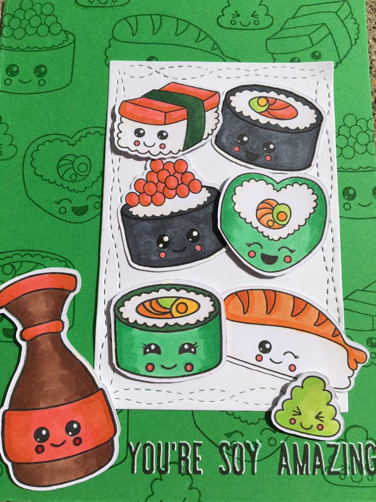 I finished my card by stamping the sentiment and highlighting it with white gel pen and popping up the soy sauce with some foam tape.