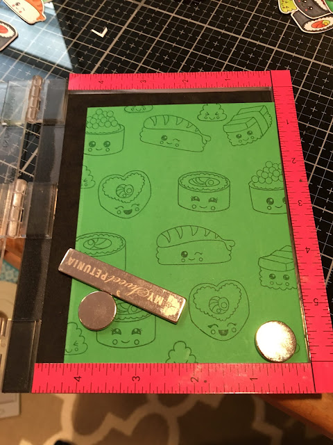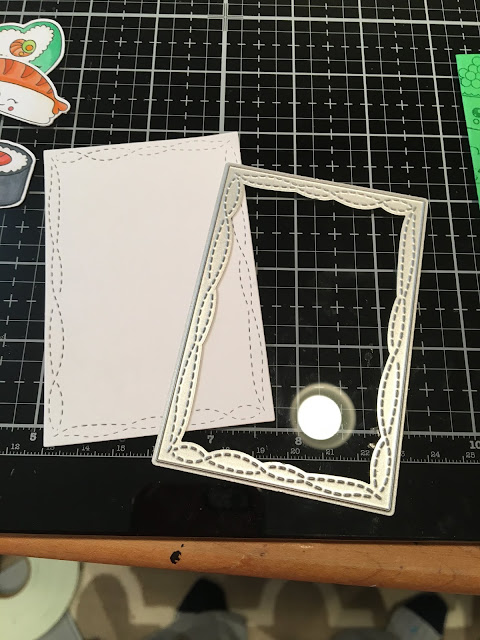 Next I die cut a white rectangle from the Kat Scrappiness Wonky Wavy Stitched Rectangle Die to frame my sushi pieces.
