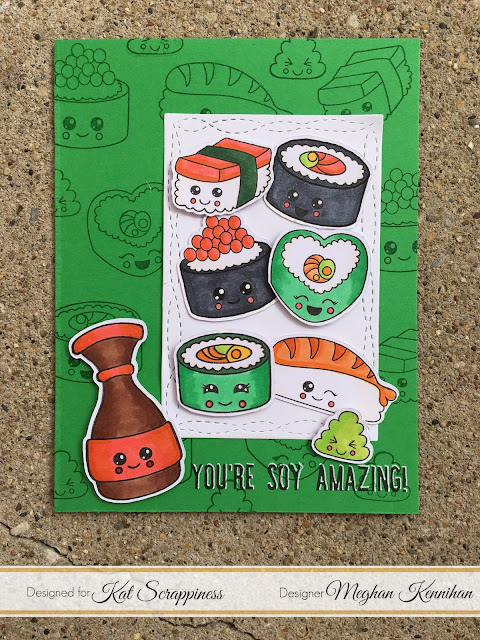 More Pun FUN at Kat Scrappiness with this fun Sushi set called “Wok On”. This set was released last week and it’s a hit! Both pun stamp sets are perfect for fun foodie cards! I mean if you don’t like sushi and avocado we need to talk. Get your “roll on”  here and use coupon code meghan for 10% off!